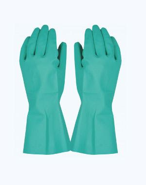 Nitrile green household cleaning gloves are suitable for use within the food, cleaning, construction, and waste management environments. These gloves protect against various chemicals, including strong detergents, oils, and certain solvents.